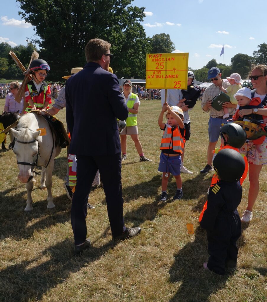 For 2025, the winners of the Unmounted Section, and the overall WInners presented with the Walter Gay Cup, were Buzzy Bee, Inky the Pony and Olivia Wright aged 2, Hot to Trot School of Equitation, Bunwell (pictured on the Attractions Page). The Mounted Section winners were the Agnew, Case, Clifton-Brown, Charlesworth, Cubitt and Sladden families with 25 years of the East Anglia Air Ambulance (pictured here).